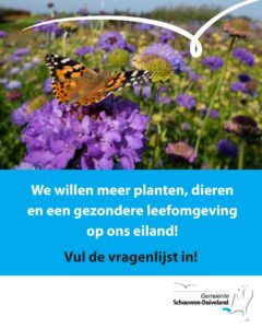 Omdat biodiversiteit dichtbij begint, in tuinen, straten, bermen, pleinen en akkers, vragen we inwoners om een korte vragenlijst in te vullen voor 31 oktober, dit duurt ongeveer 10 minuten en kan via https://denkmee.schouwen-duiveland.nl/ > kies het project ‘’Denk mee over de natuur op Schouwen-Duiveland’’ . Uw inbreng helpt de gemeente bij het maken van een plan en een uitvoeringsagenda voor de komende jaren