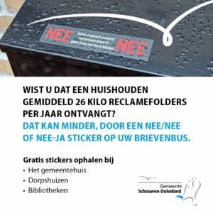U kunt met een Nee/Ja- of Nee/Nee-sticker aangeven welke reclame uw wel en niet wil ontvangen. Haal hem gratis op in uw dorpshuis, bibliotheek of op het gemeentehuis.